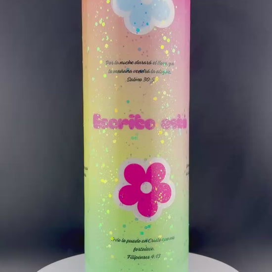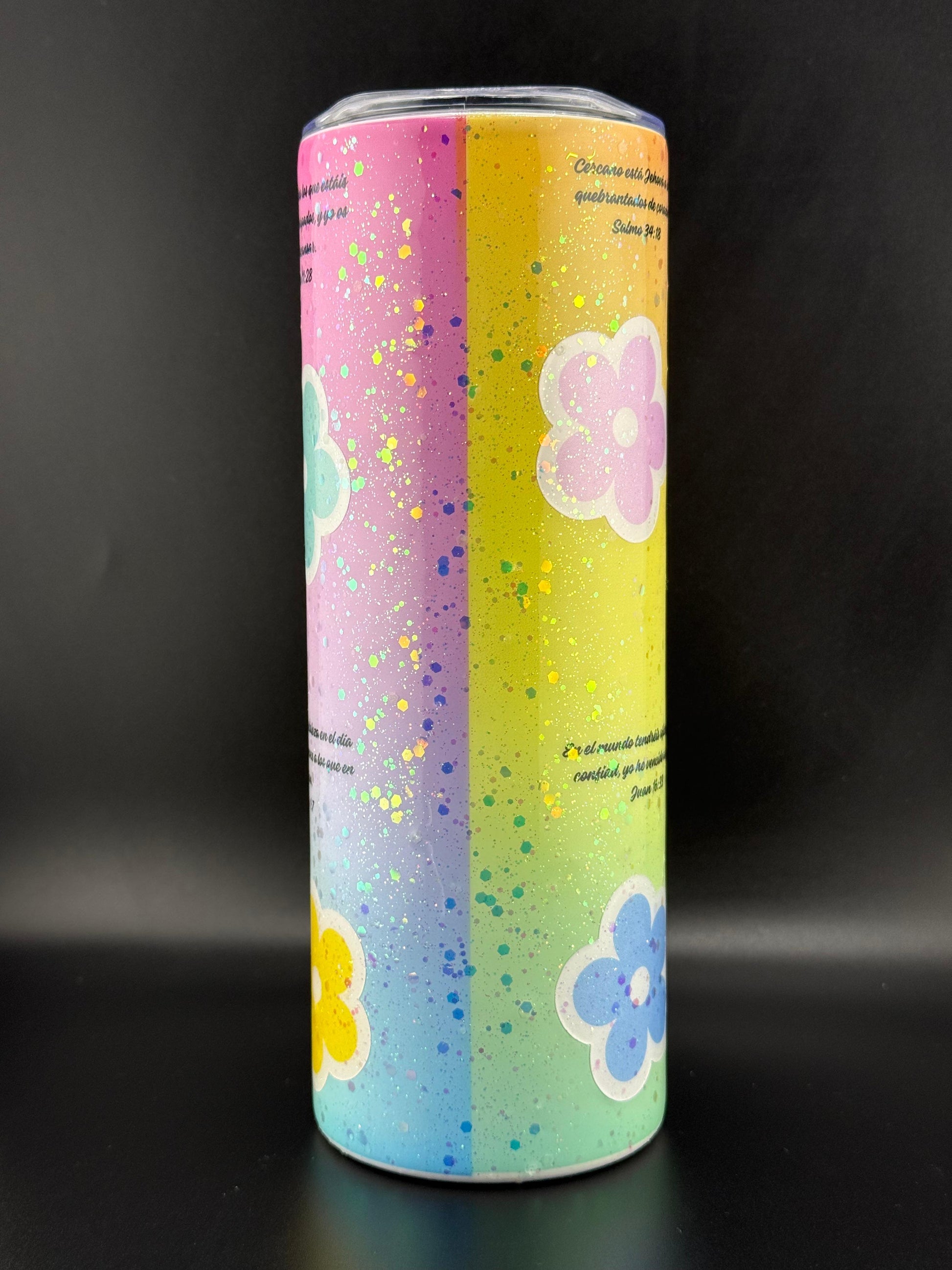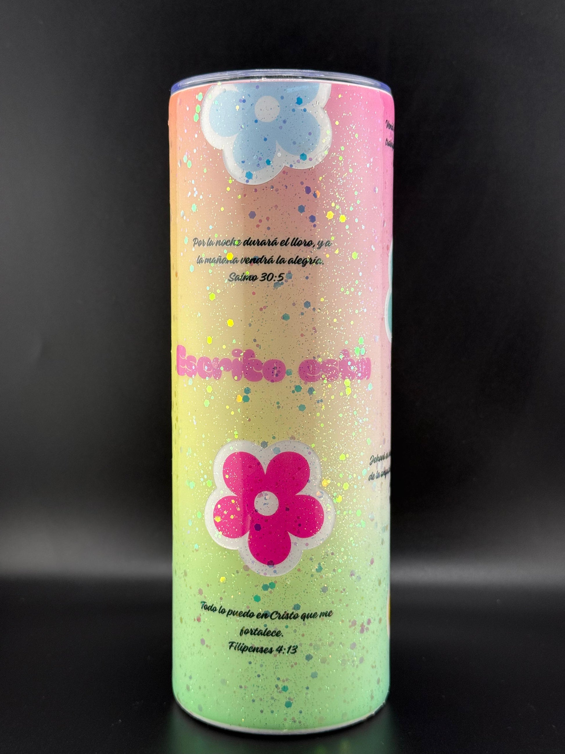 Este vaso térmico cristiano y motivador es más que un accesorio: es un recordatorio diario de la Palabra de Dios. Diseñado con colores vibrantes, flores alegres y detalles brillantes, incluye versículos bíblicos de fortaleza y esperanza como: