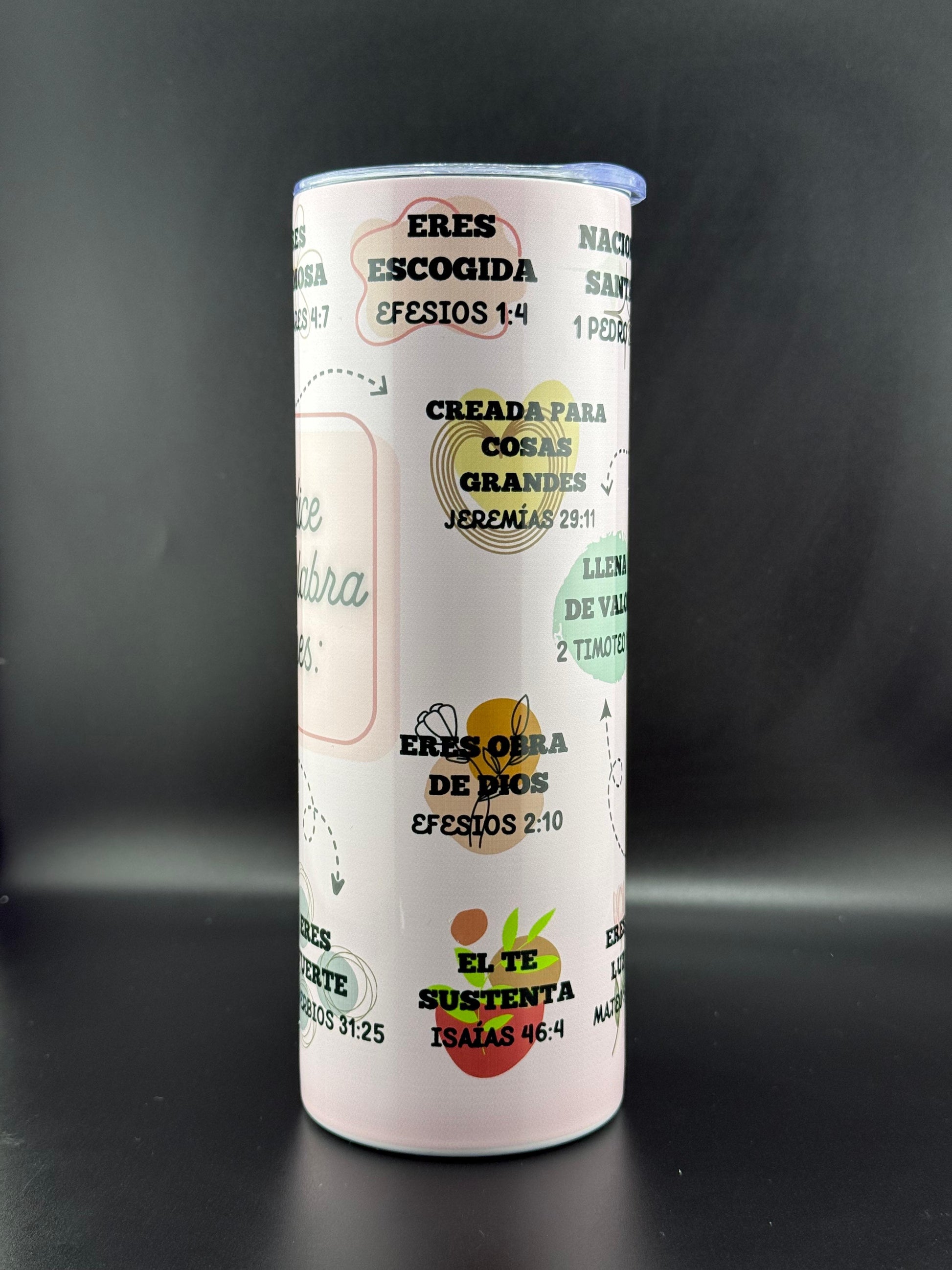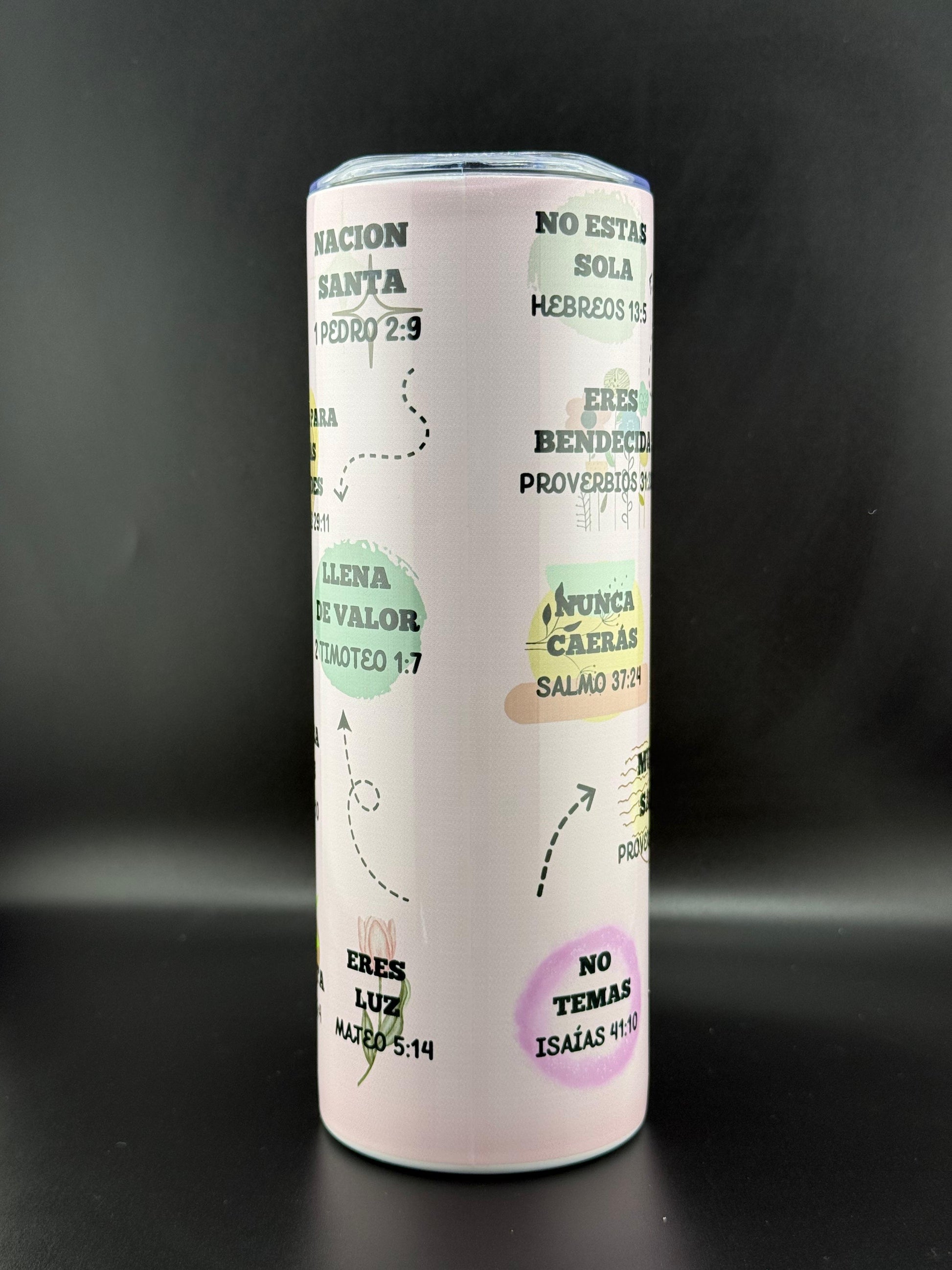 Con un diseño moderno, colorido y lleno de detalles, este vaso incluye versículos y afirmaciones bíblicas como: