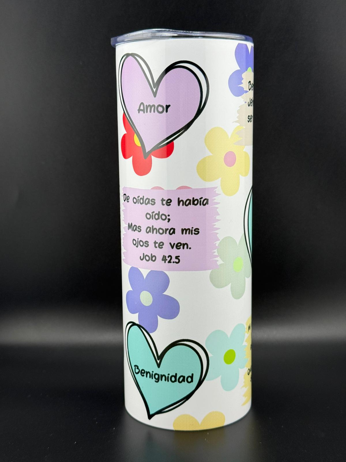 Disfruta de tu bebida favorita mientras compartes la Palabra de Dios con este vaso térmico de 20 onzas. Decorado con corazones y flores en colores vibrantes, incluye versículos bíblicos de inspiración y promesas como: