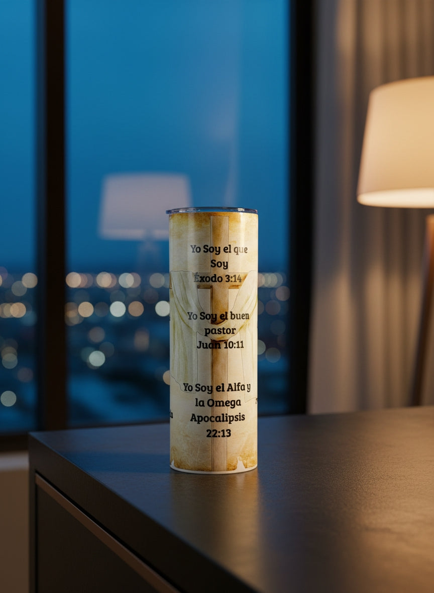 Lleva contigo un recordatorio de las promesas de Cristo con este vaso térmico de 20 onzas. Su diseño exclusivo presenta los versículos más importantes donde Jesús declara quién es: ✨ “Yo Soy la luz del mundo” (Juan 8:12) ✨ “Yo Soy el camino, la verdad y la vida” (Juan 14:6) ✨ “Yo Soy el buen pastor” (Juan 10:11) ✨ “Yo Soy la resurrección y la vida” (Juan 11:25) ✨ “Yo Soy el Alfa y la Omega” (Apocalipsis 22:13) y muchos más…